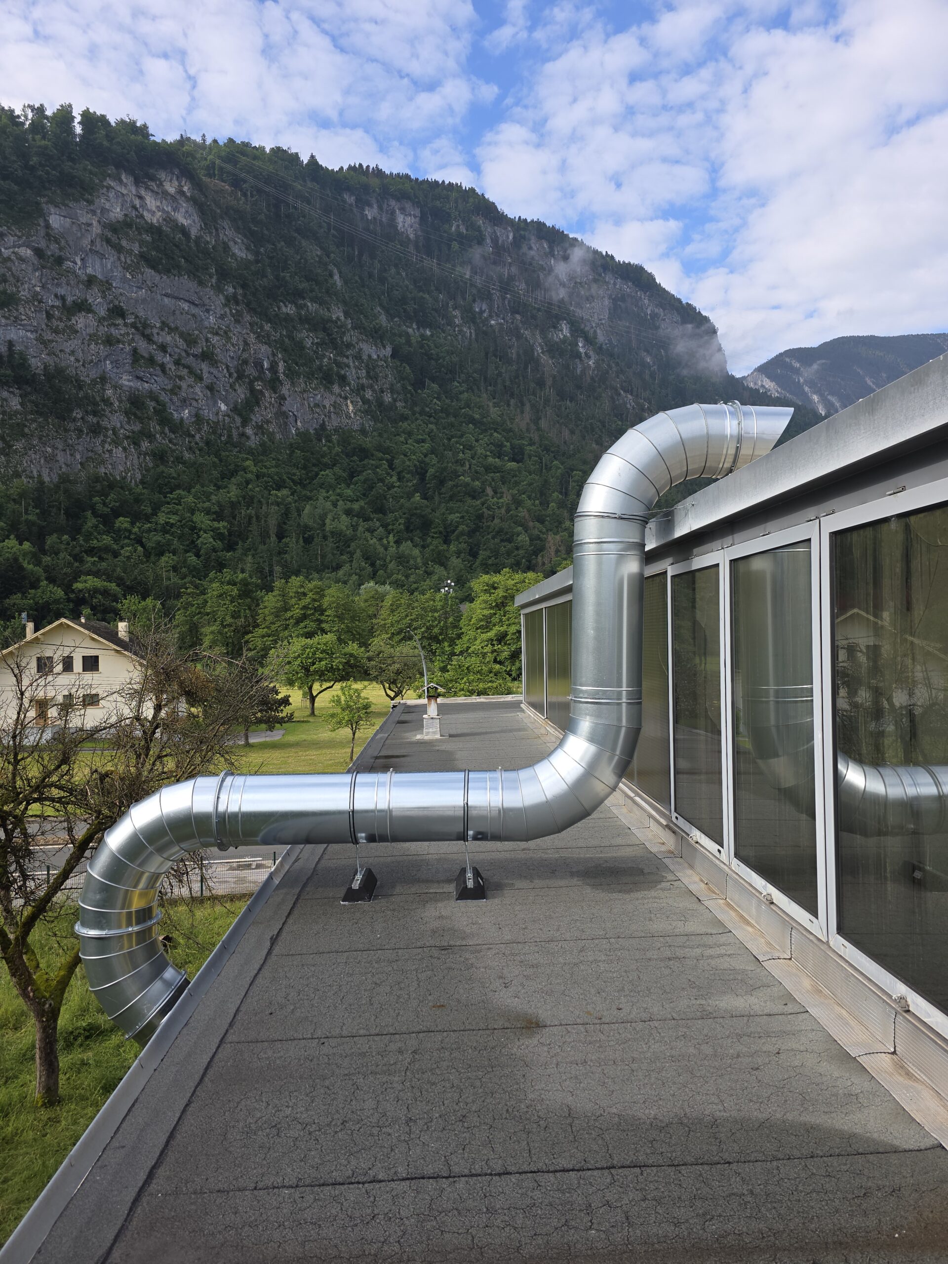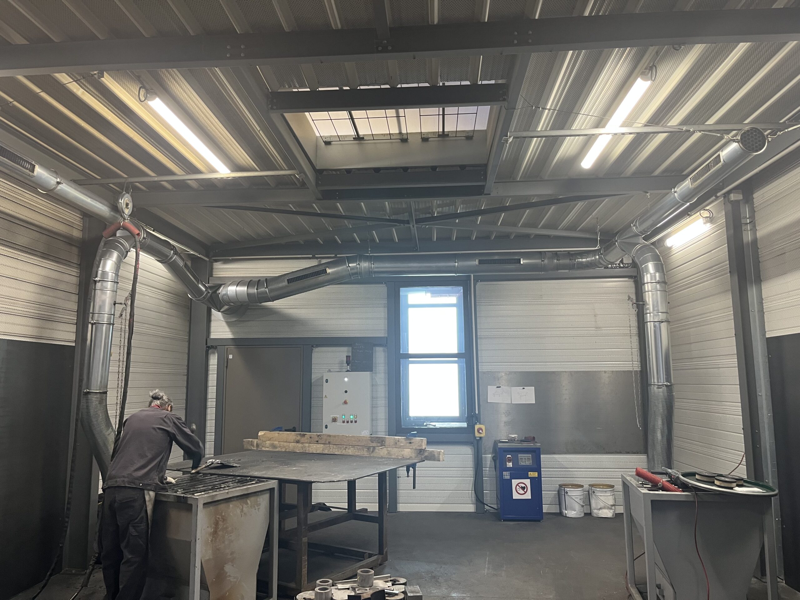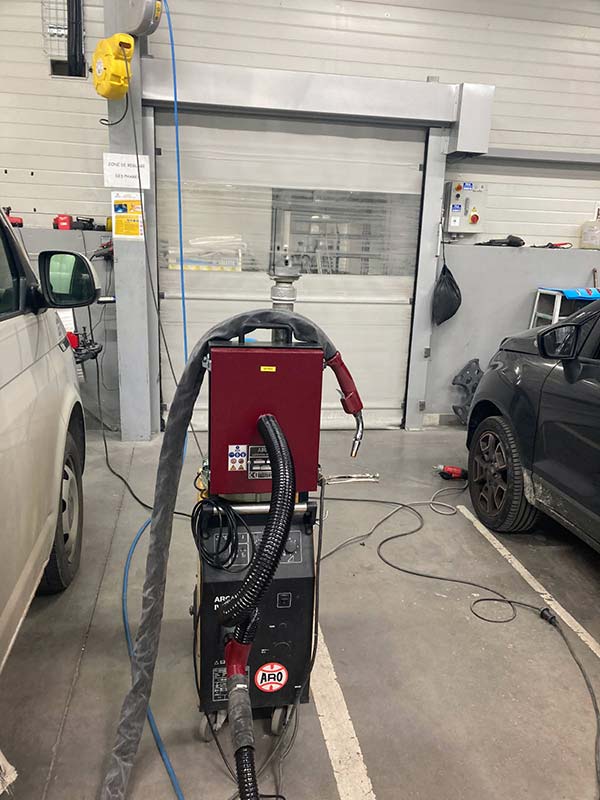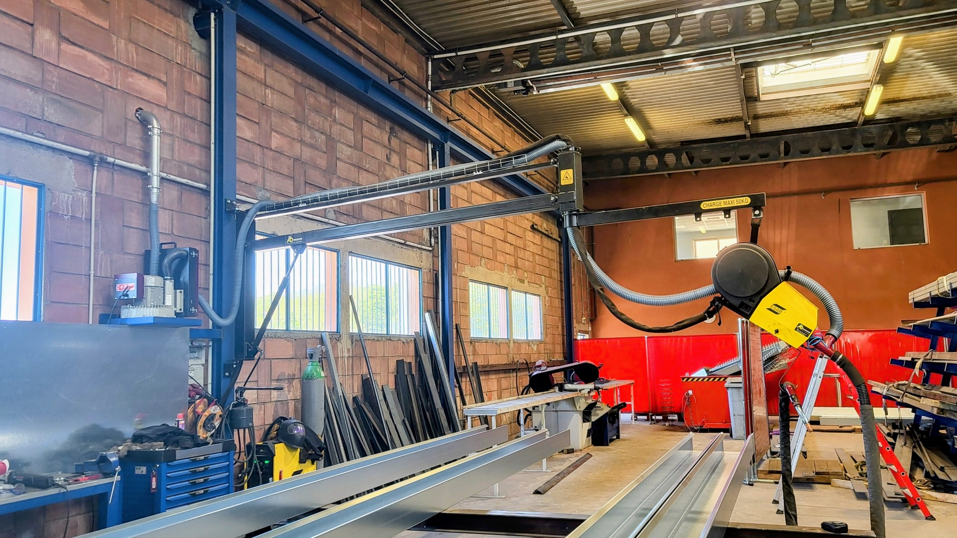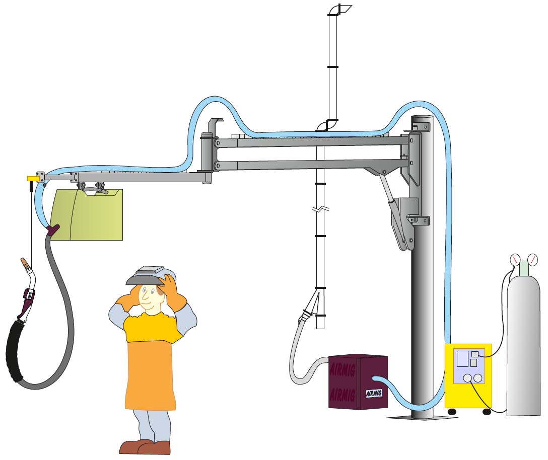 Installation d’ensembles torches aspirantes et groupes aspirants AIRMIG sur potence.