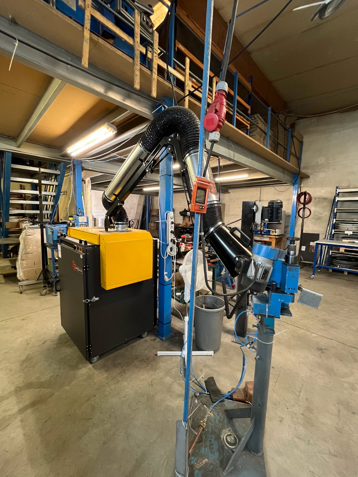 Torche aspirante maintenue par équilibreur à câble, implantée sur potence porte dévidoir sur fût, reliée au groupe aspirant avec rejet extérieur par cheminée d’évacuation.